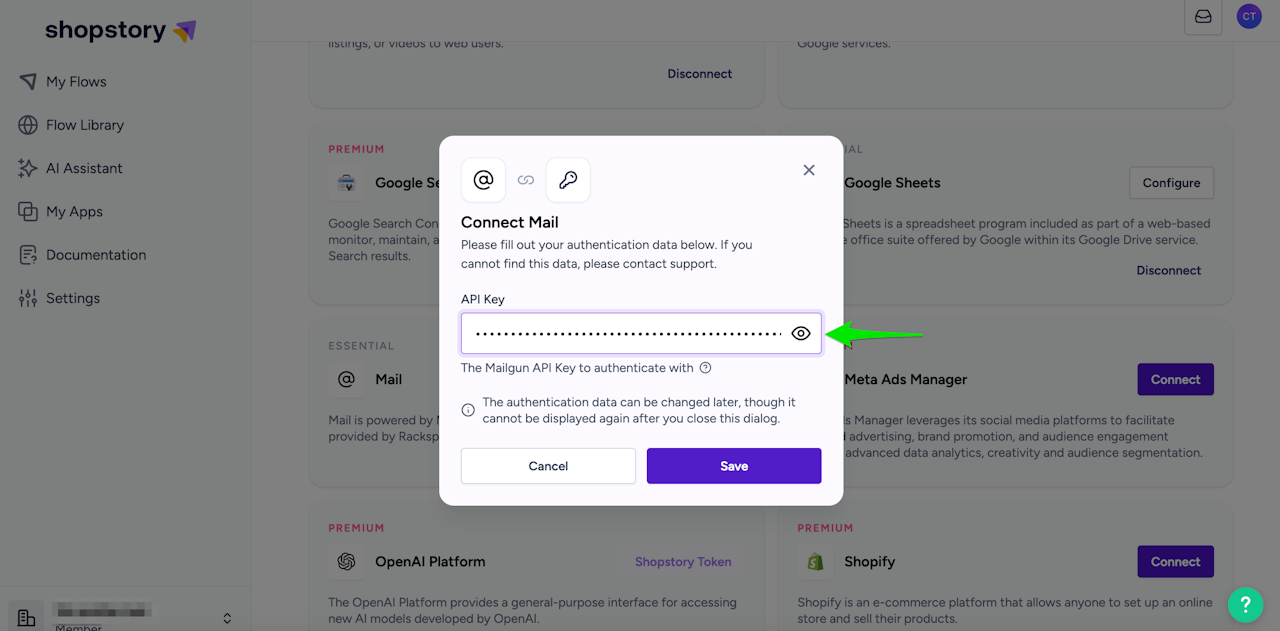 After creating your API key add it to the input field shown when you want to connect with Mailgun.