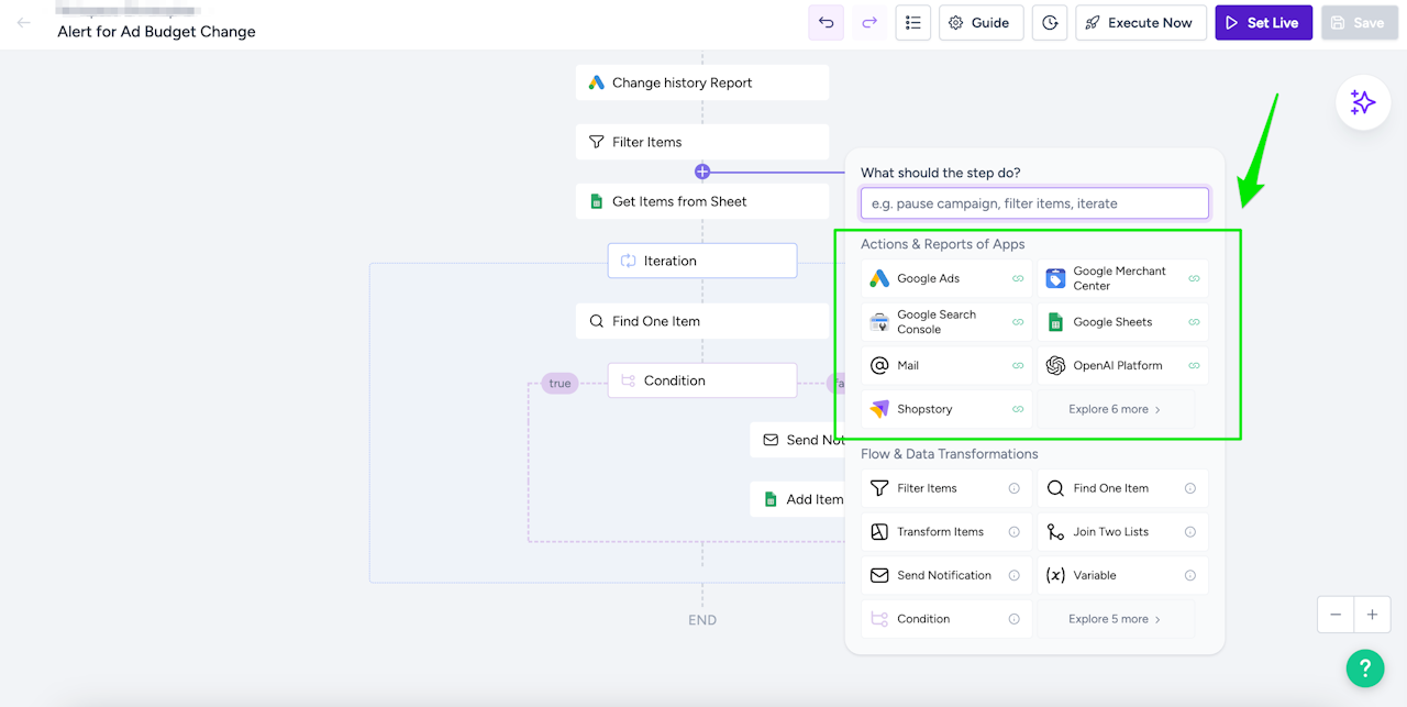 Google Ads App: Actions like "Campaigns Report" or "Change Keyword Status".