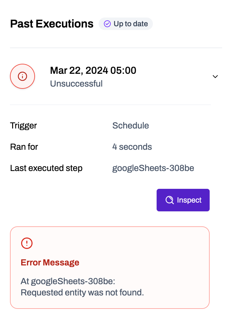 If your error states: "At googleSheets-308be: Requested entity was not found." it means that the linked spreadsheet or sheet is not available/accessible.