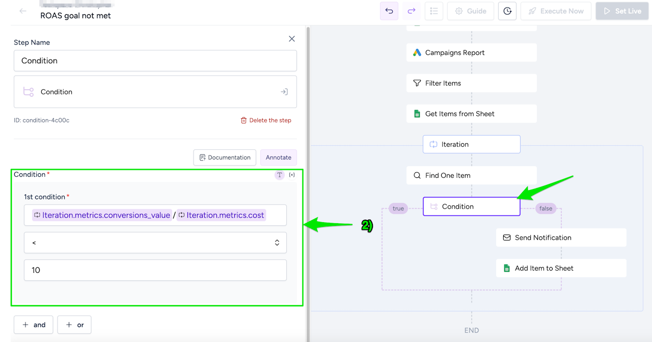 (2) Another use case for conditions is incorporating them into formulas. For instance, you can calculate Return on Ad Spend (ROAS) by dividing conversion value by cost and then set a threshold to determine when an action should be triggered.