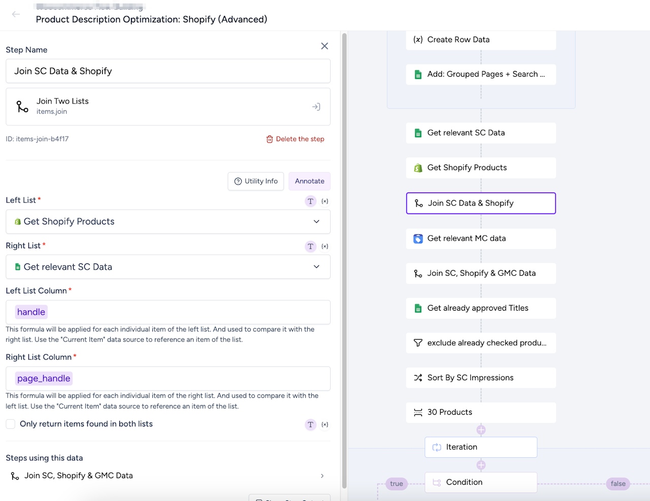 Add the "Join Two Lists" Utility – Insert this utility into your flow where you need to merge two datasets.
