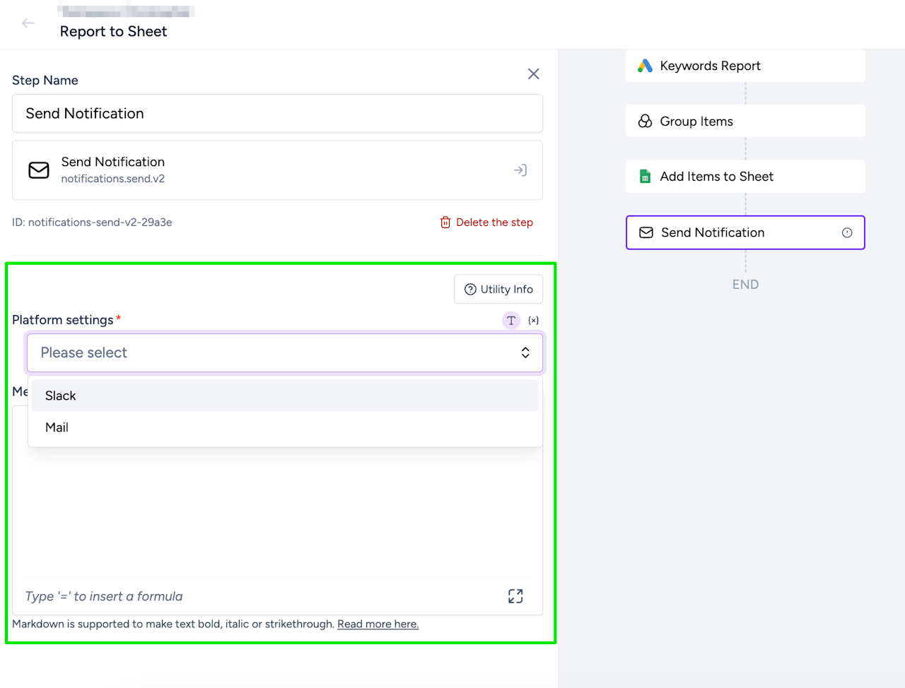The Send Notification utility allows you to send custom messages as part of your automated Flows. This is useful for alerting team members, triggering updates in communication tools, or logging important events.
