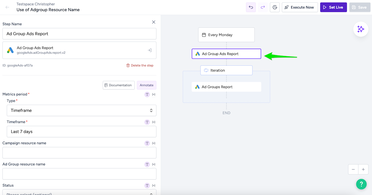 3.) Add the Ad Group Resource Name from your iteration as input for your Ad Groups Report