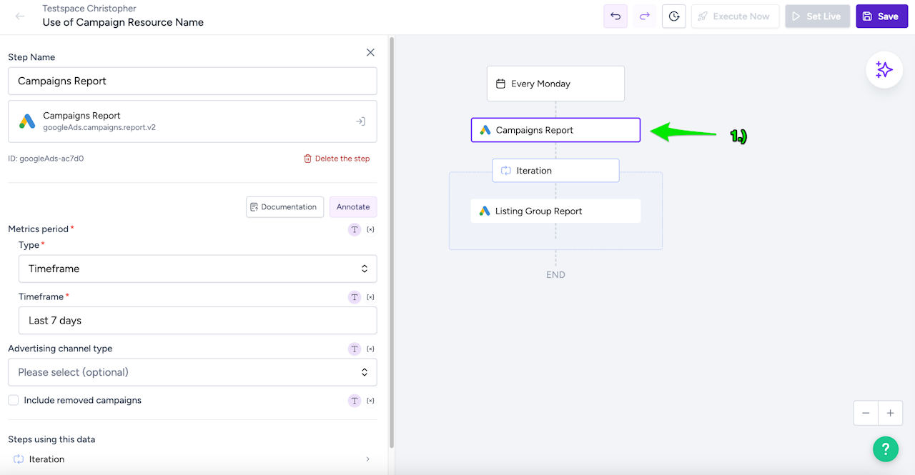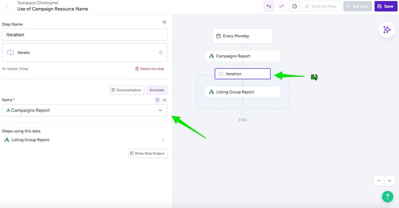 2.) Use an iteration to iterate over the Campaign Report and perform the Listing Group Report per Campaign Resource Name which equals to getting access to the Listing Group Report per Campaign.