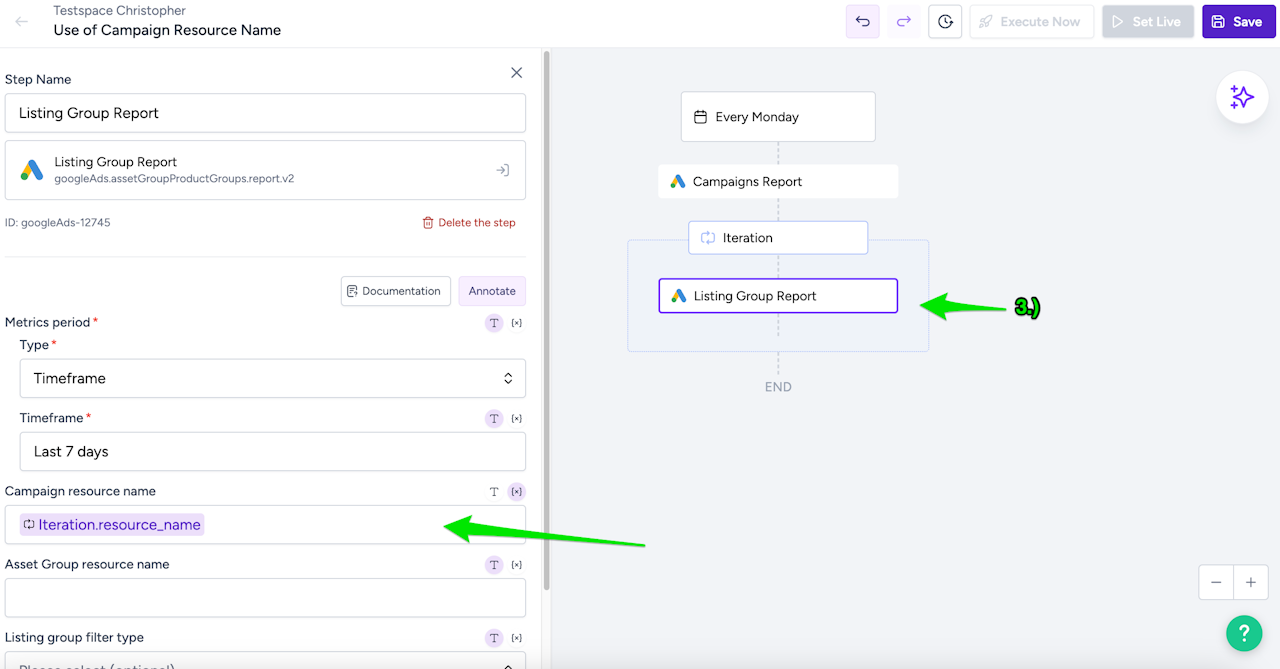 3.) Add the Campaign Resource Name from your iteration as input for your Listing Group Report