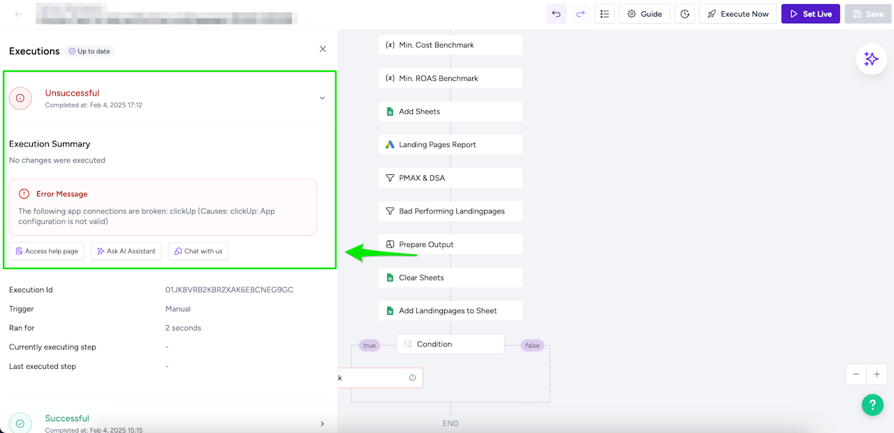 If your app connection is broken, the Flow execution will not start, preventing unnecessary runtime and failed executions. As a result, you won’t be able to inspect your Flow until the connection is restored.
